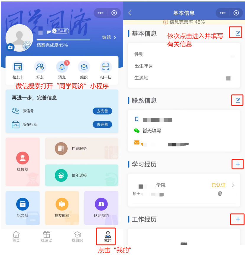 第三步:补充完善个人信息。通过填写完整的个人信息与校友数据库进行系统匹配,若匹配成功,则自动认证成功。