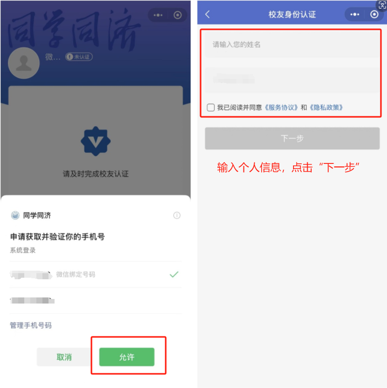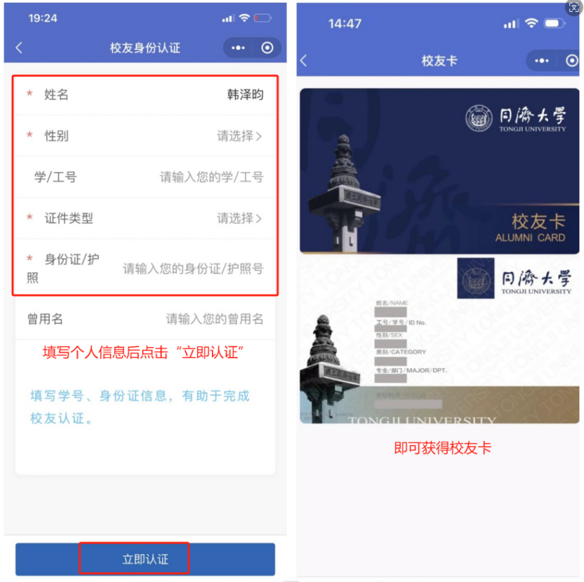 第二步:认证。通过填写完整的个人信息与校友数据库进行系统匹配,若匹配成功,则自动认证成功。