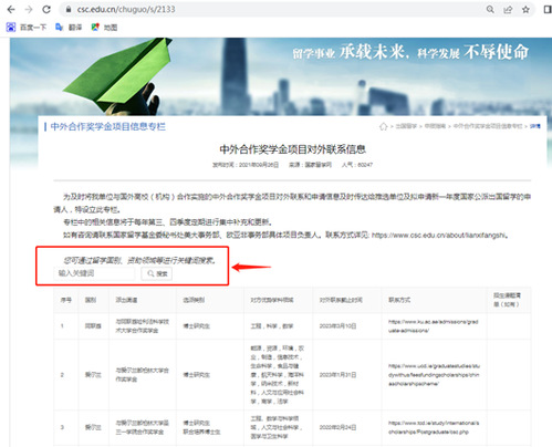 图3:中外合作奖学金对外联系专栏(可通过留学国别等关键词检索)