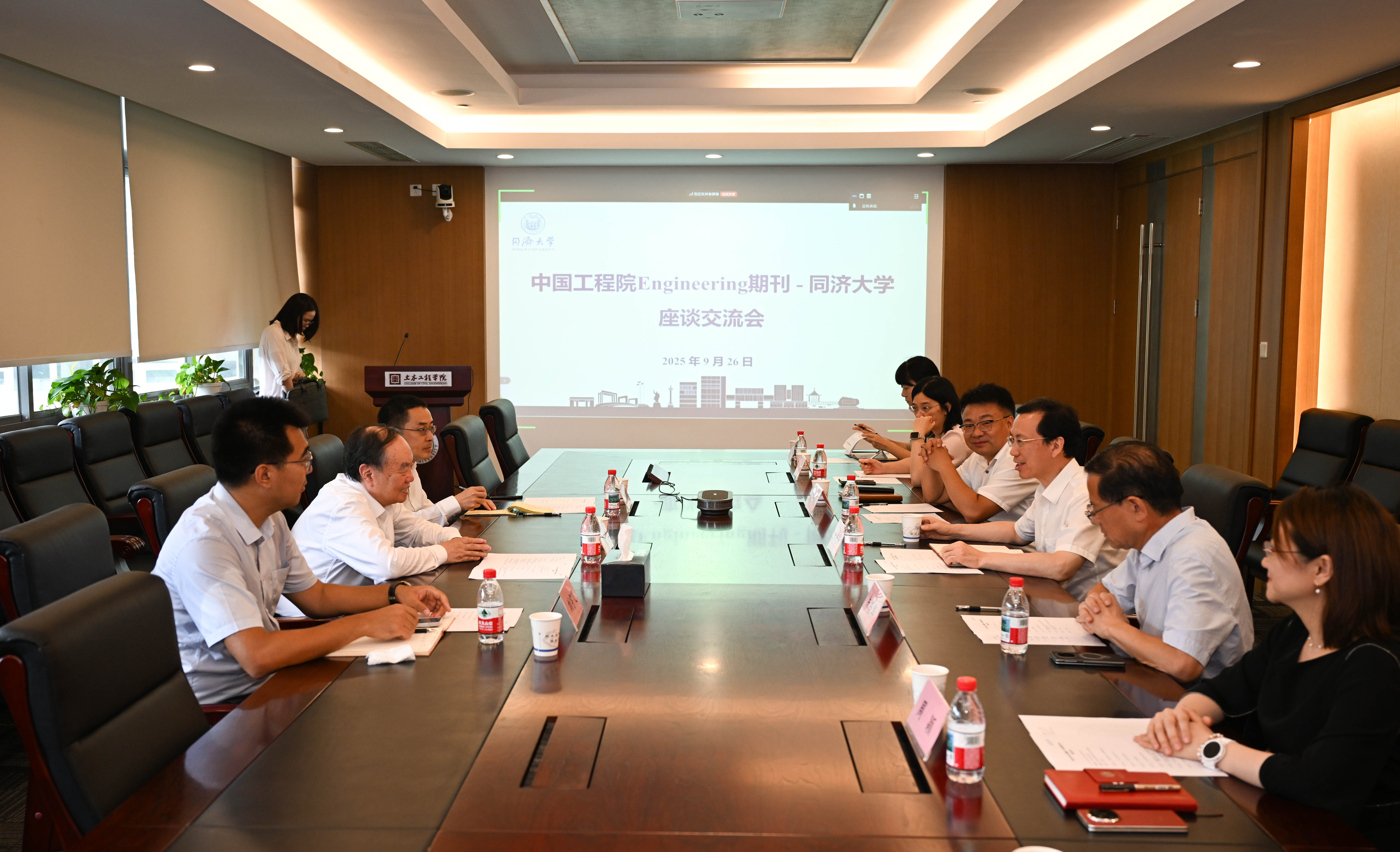 会上,周颖汇报了Engineering土水建学科的发展举措,重点谋划重大基础设施场景驱动与AI赋能的前沿选题,充分发挥学科国际化优势,强化会刊联动,加强高水平国际化编委队伍的建设。刘芳汇报了FSCE在发展新阶段重点围绕交叉前沿重塑期刊定位的工作进展。与会各方围绕期刊建设的具体举措展开了热烈讨论。崔俊芝、朱合华表示将依托同济土木学科的优势资源,全面支撑Engineering土水建学科和FSCE的高质量发展。阳化冰表示,高等教育出版社始终高度重视中国科技期刊发展,将继续发挥出版资源与学术传播的优势,全面助力Engineering系列期刊的国际影响力提升。
