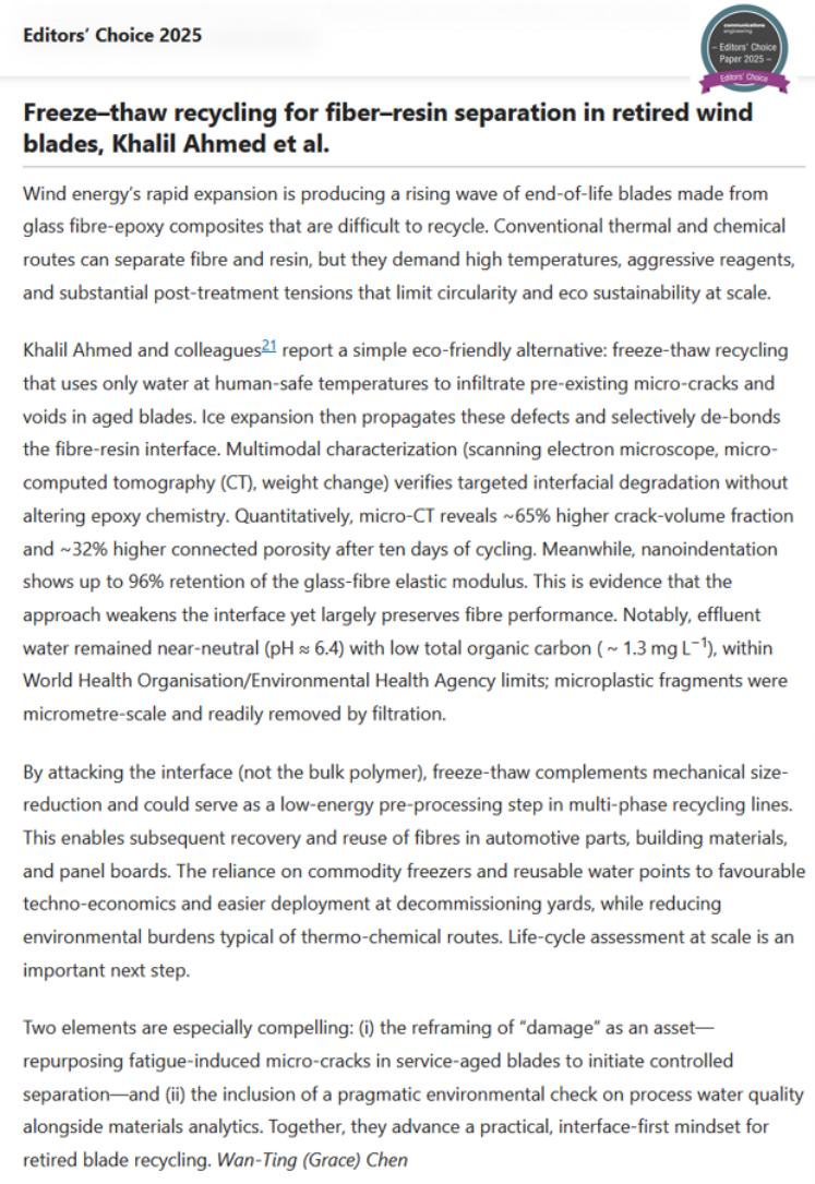 近日,Nature旗下首个工程领域子刊《通讯·工程》(Communications Engineering)评选出2025年度最佳论文共20篇(涵盖各医疗、电子、汽车、机械、土木等多个领域),其中,土木工程领域共2篇,我院姜旭副教授、强旭红副教授、博士后Khalil Ahmed发表的“退役风机叶片中纤维与树脂分离的冻融循环回收法(Freeze-thaw Recycling for Fiber–resin Separation in Retired Wind Blades)”入选!