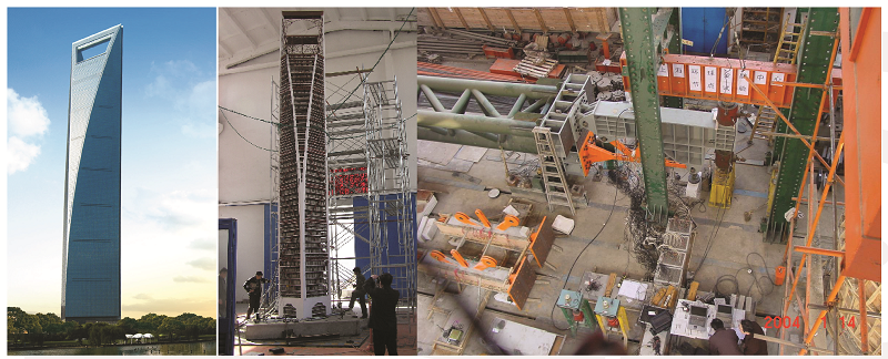 抗震试验,中图为节点试验,右图为结构模型抗震试验