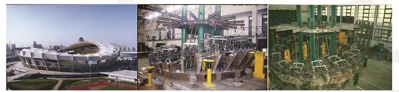 整体模型半拉半压试验,大型悬挑屋盖钢结构整体模型静力试验,中图为整体模型半拉半压试验,右图为大型悬挑屋盖钢结构整体模型静力试验