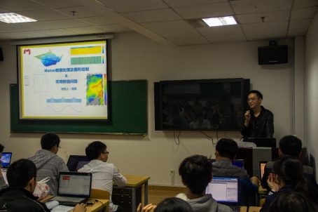 最后,进入此次交流会的核心阶段。段魁学长针对MATLAB在土木专业方面的实际应用,从数据统计分析、图像编辑和数值分析三个专题进行细致的讲解。在历届数学建模比赛中,数据统计分析类型的题目层出不穷,段魁学长具体介绍了此类问题的常用解法——聚类分析法、主成分分析法,并简要说明了MATLAB统计工具箱的使用。图片也是学术论文的重要组成部分,是所做工作成果的有效说明。段魁学长介绍了他丰富的MATLAB图像编辑的经验,推荐大家使用句柄函数从而方便快捷地编辑图像,并通过对南海部分海域动态图的绘制,向大家展示了MATLAB图像编辑的强大技巧。对于研究生在课程学习中常常遇到的微分方程的求解问题,段魁学长向大家演示了运用MATLAB对微分方程进行数值求解的算例,他还不时地加以板书,便于同学们理解。