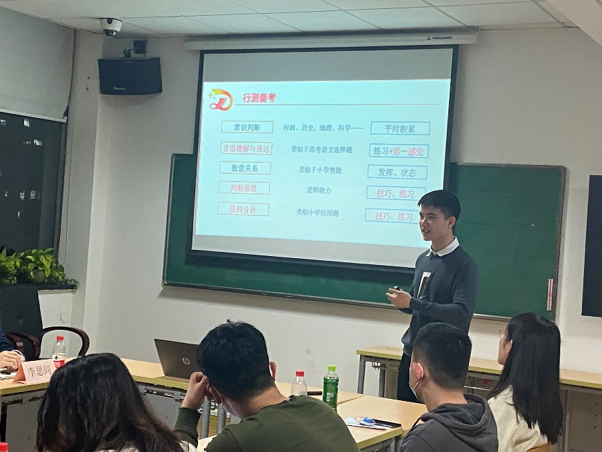 而后学长为大家分享了一些备考干货,如怎样准备行测、准备申论等等,向有意愿备考的同学推荐了几款学习app,并且结合自身备考经验详细分享了如何分科目备考笔试与面试。