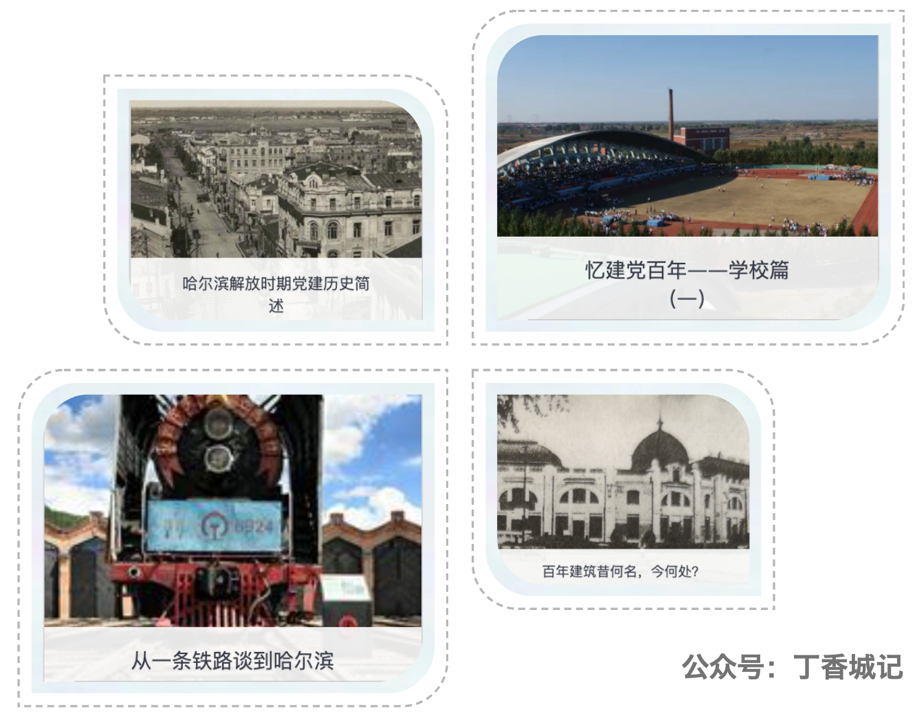 4.宣传推送,传承党的精神,弘扬家乡史志 为了更好地宣传家乡的党史地志,团队成员设立了“丁香城记”公众号,将文献学习、调研访谈等成果加以推广。“哈尔滨解放时期党建历史简述”对解放时期哈尔滨历史进行了精炼的概括,“忆建党百年——学校篇”“百年建筑昔何名,今何处?” “从一条铁路谈到哈尔滨”等文章更是以生动有趣的形式、丰富多样的切入点展示家乡历史的方方面面。在此过程中,团队成员不仅解锁了推送排版的新技能,更是在践行文化传承与历史弘扬的过程中,深化了自己的认知与信念。