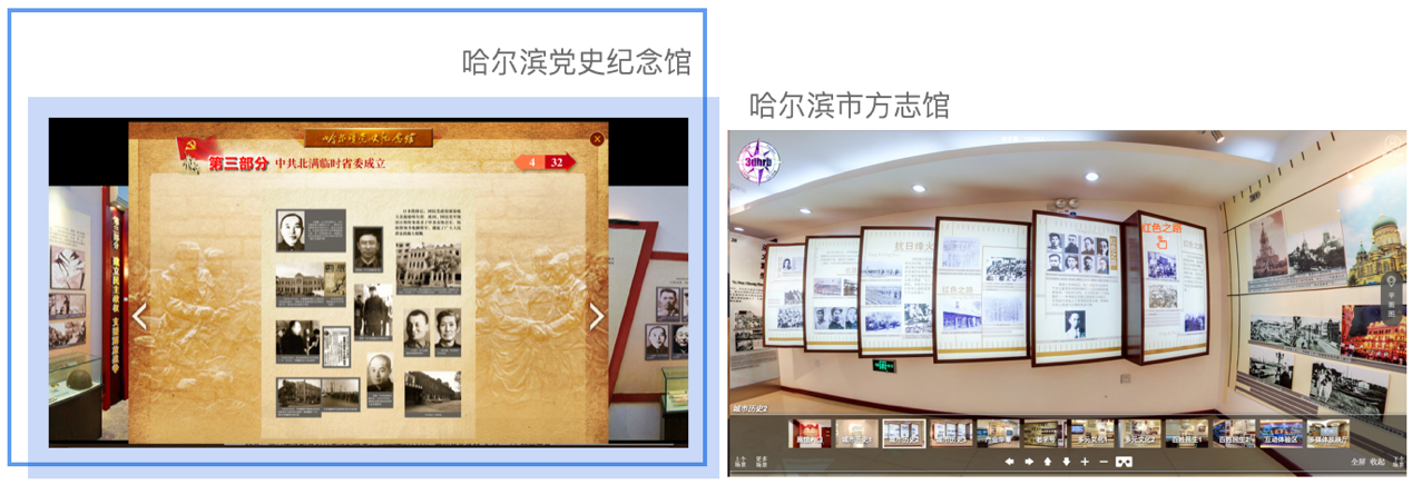 2.展馆参观,形成历史格局,丰富所知所学 仅依靠书籍与网络获取碎片化信息,很难形成对历史的整体认知,而考虑到防疫的有关规定,团队成员便通过哈尔滨党史纪念馆、哈尔滨市方志馆的网上立体展厅的参观,弥补了无法实际走访红色教育基地的遗憾,获取更原始、更准确的历史资料,进行更全面的认知与学习,通过浏览老照片、老物件、条例文件原稿等展品,脑海中的画面更加明晰,也更真切地体会到了哈尔滨历史的磨难与辉煌。
