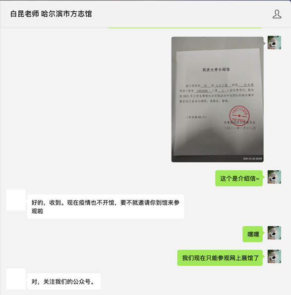 3.调研访谈,了解民众认知,思索史志宣传 团队成员在学习哈尔滨史志后,针对自身的体会,通过问卷星平台发放了调研问卷,主要调研哈尔滨市民对哈尔滨解放时期党史的了解情况,以及对史志宣传的看法。同时在线上对哈尔滨党史纪念馆马天龙老师、哈尔滨市方志馆白昆老师进行了访谈,在此过程中,团队成员不仅体会到了史志工作者心中的热爱与志向,也以更多元化的视角了解到了史志宣传的多样途径与现有问题。综合以上调研访谈结果与所查资料,团队成员总结得出了史志宣传推广方面的有益建议。