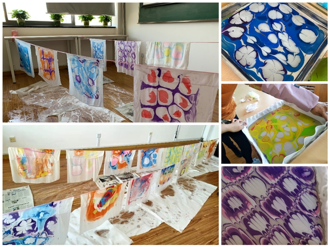 水拓丝巾,即在水面上作画,根据油水不相混溶的原理,通过对水面拨动等方法,形成花纹或相应的纹理,最后把丝巾轻铺水面,这就是缘起于丝绸之路、被列入世界非物质文化遗产的水拓丝巾。到场教职工们根据老师的指导说明设计花纹、挑选颜色、创意制作、定色成型,最后得到一条独一无二的丝巾。