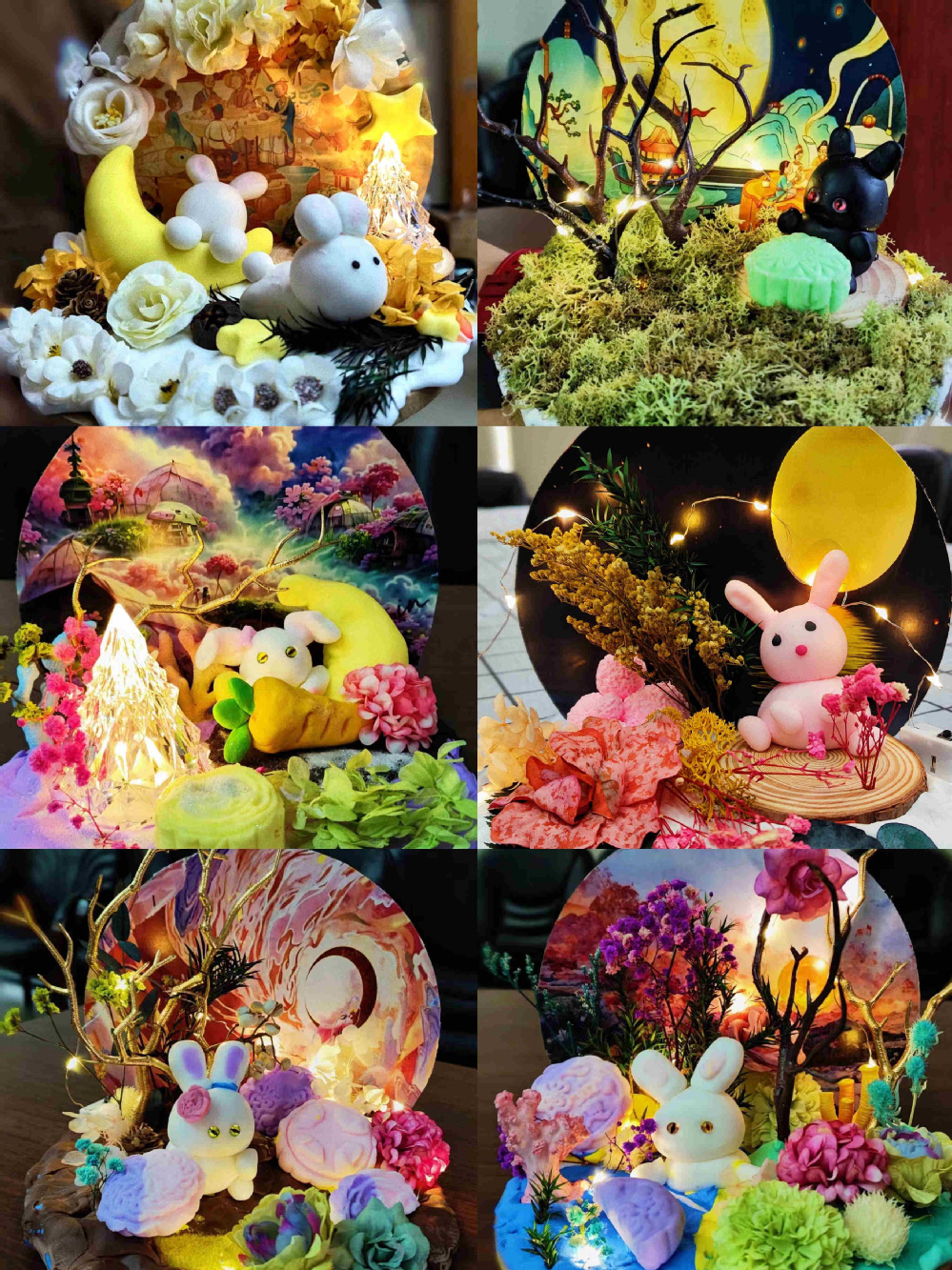 制作老师讲述了彩泥揉搓方法、基础色彩搭配、摆件整体布局等制作步骤和要点之后,教职工们就投入到了设计和创作当中,先用彩泥制作月兔、月饼等主题摆件,辅之以干花、珊瑚、海草等装饰点缀,发挥各自的想象力和创造力进行艺术创造,制作出独一无二的中秋主题月兔摆件。制作过程中,教职工们边讨论边制作,在放松身心中增进了同事之间的交流互动。